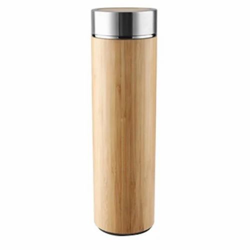 Stylish water bottle with bamboo exterior and stainless steel interior. Perfect for office use, keeps beverages hot or cold.