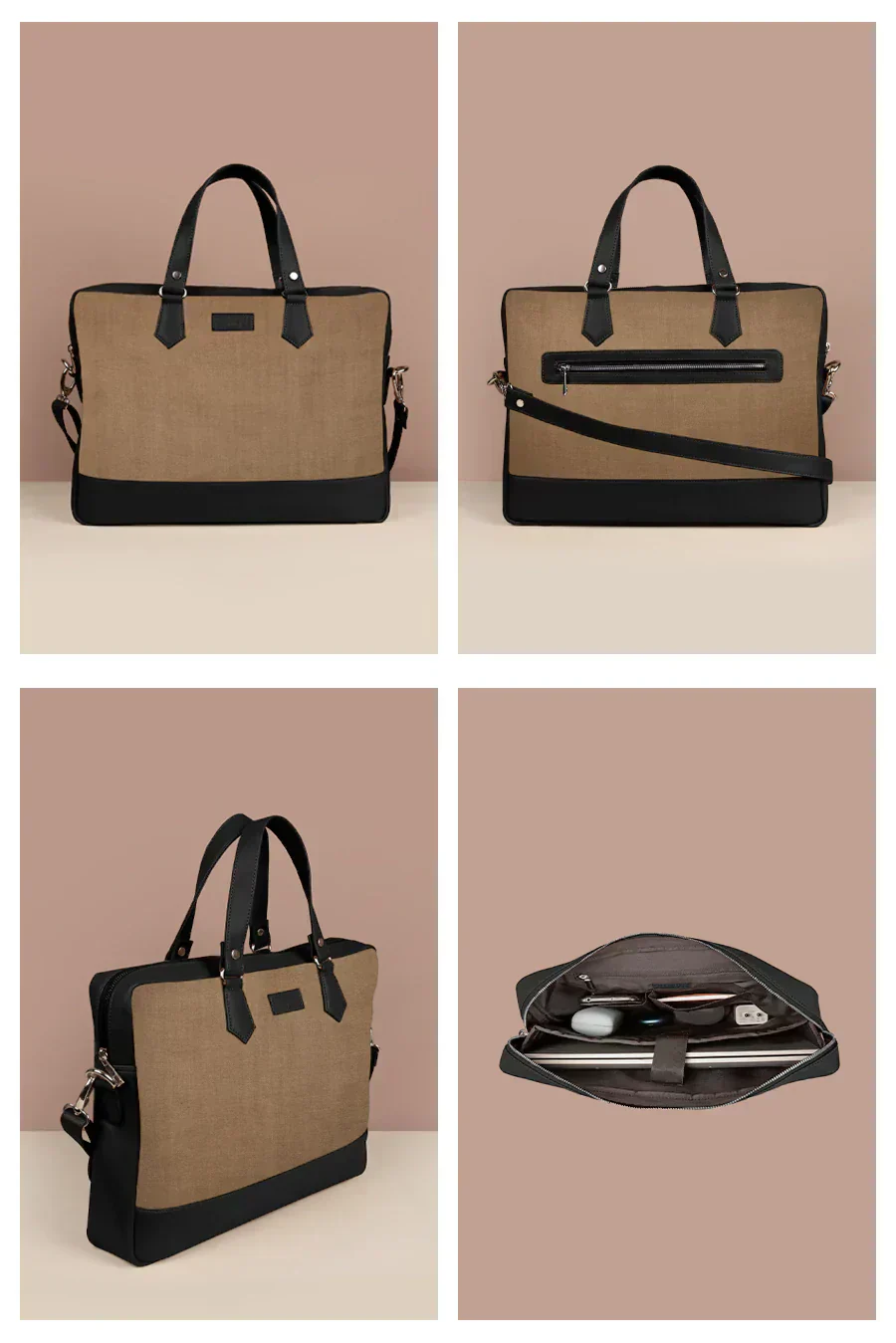 Durable laptop bag made from natural jute fiber. Features padded compartment for laptop protection and multiple pockets for accessories.